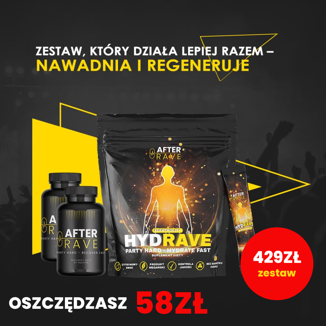 🔍 Szukasz sposobu, by bawić się bez obaw o kolejny dzień? Zestaw After Rave + HydRAVE to duet, który zadba o Twój organizm przed, w trakcie i po imprezie.